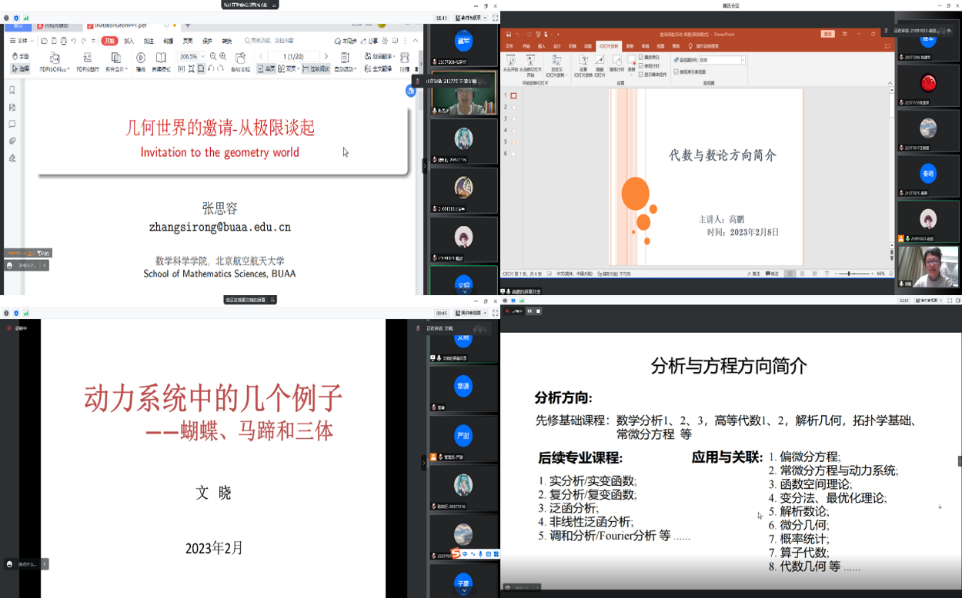 张思容老师、高鹏老师、文晓老师、戴蔚老师分别带来了几何拓扑、代数与数论、微分动力方程、分析四个专题方向的数学前沿科普讲座。四位老师以鲜活的实例,为同学们揭示数学的精妙,并就今后的数学学习提供了诸多建议。