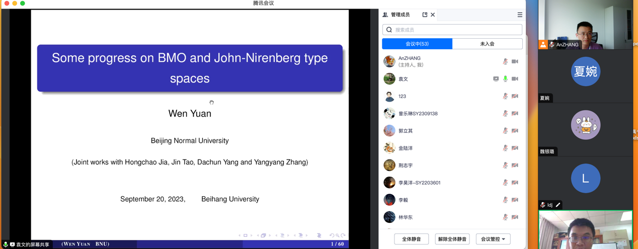 2023年09月20日,北京师范大学袁文教授,应邀为太阳集团tcy8722师生做了题为 “Some progress on BMO and John- Nirenberg type spaces”的学术报告。报告由张安老师主持。