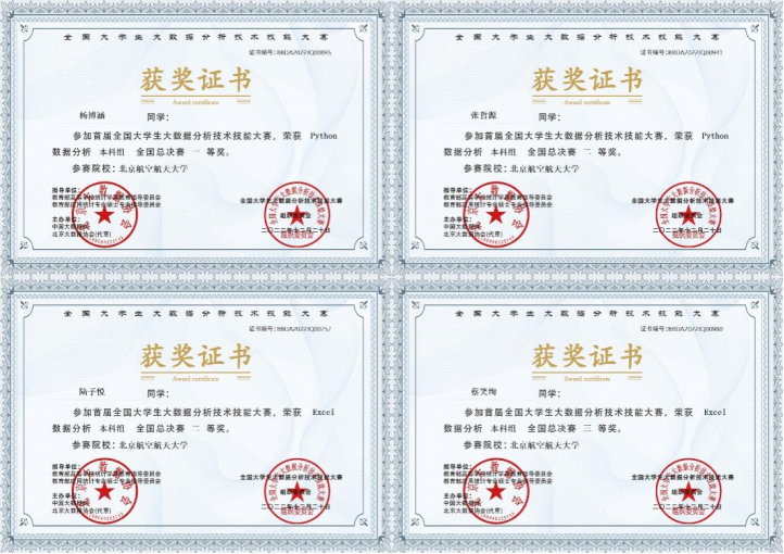 自本届比赛2022年8月启动以来,公司领导高度重视大力支持,统计与运筹系罗雪老师、刘超老师积极组织动员,公司共有24人次参加本次大赛,其中太阳集团tcy872220人,机械工程及自动化公司4人。通过刘超老师、戴蔚老师等的悉心指导,在省级赛中,24名参赛同学在万余名选手中脱颖而出,获得北京赛区一等奖4项、二等奖4项、三等奖6项等14项奖励。其中,公司本科生杨博涵、张哲源、蔡笑绚以及机械工程及自动化公司陆子悦等4名一等奖获得者晋级全国总决赛,经过激烈角逐,最终获得全国一等奖1项、全国二等奖2项和全国三等奖1项的优异成绩,同时获得北京大数据协会《初级数据分析师》证书。与此同时,刘超、戴蔚两位老师获得指导教师奖。