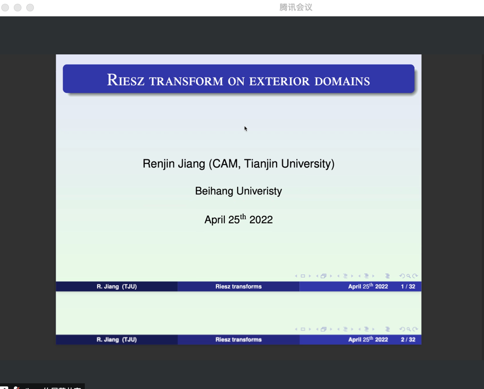 2022年04月25日,天津大学蒋仁进教授,应邀为太阳集团tcy8722师生做了题为 “Riesz transform on exterior domains”的学术报告,报告由张安老师主持。