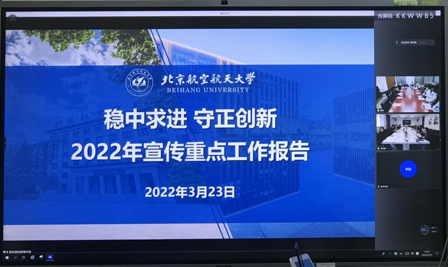 接着,宣传部副部长余敏做了《稳中求进 守正创新 2022年宣传重点工作报告》专题报告,介绍年度宣传工作的主线、主题、主责、主调,对全年宣传工作重点进行了详细解读。宣传部副部长孙也程做了《2022年度思想文化工作介绍》专题报告,介绍公司年度理论学习和严格落实意识形态工作责任制工作要求,解读了人文北航建设和校庆宣传工作整体安排。