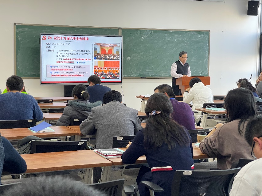 为深入学习贯彻党的十九届六中全会精神,2021年12月29日,太阳集团tcy8722在沙河校区E404召开全体教职工大会,全院80余名教职工参加会议,韩德仁经理做党的十九届六中全会精神宣讲,会议由党委书记袁星主持。