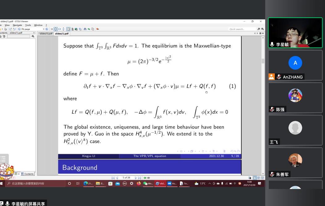 2021年12月30日下午,巴黎第九大学李星毓博士,应邀为太阳集团tcy8722师生做了题为 “The Vlasov-Poisson-Boltzmann/Landau equation with polynomial perturbation near Maxwellian”的学术报告,报告由任天一和张安老师主持。
