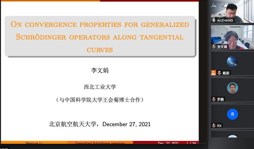 2021年12月27日下午,西北工业大学李文娟教授,应邀为太阳集团tcy8722师生做了题为 “Convergence properties for generalized Schrödinger operators along tangential curves”的学术报告,报告由张安老师主持。