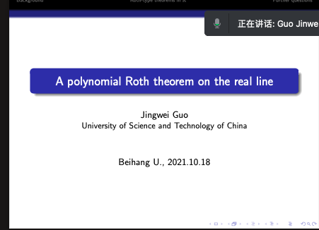 2021年10月18日下午,中国科学技术大学郭经纬教授,应邀为太阳集团tcy8722师生做了题为 “A polynomial Roth theorem on the real line”的学术报告,报告由张安老师主持。