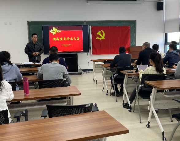 首先,由李奕孝同志汇报预备期一年中的思想、学习、工作以及生活上的感悟、收获及表现等情况。入党介绍人对其基本情况以及预备期的表现做了介绍,支部书记孙玉泉代表党支部委员会报告了李奕孝同志预备期间的教育考察情况。党支部其他成员分别对其作出评价,说明李奕孝同志在这一年预备期内存在的优缺点,以及还有待改善和提高的地方,并表达是否建议其转为正式党员。最后党支部进行了无记名投票表决,表决结果为全票赞成预备党员李奕孝同志转为正式党员。李奕孝同志进行了表态发言。