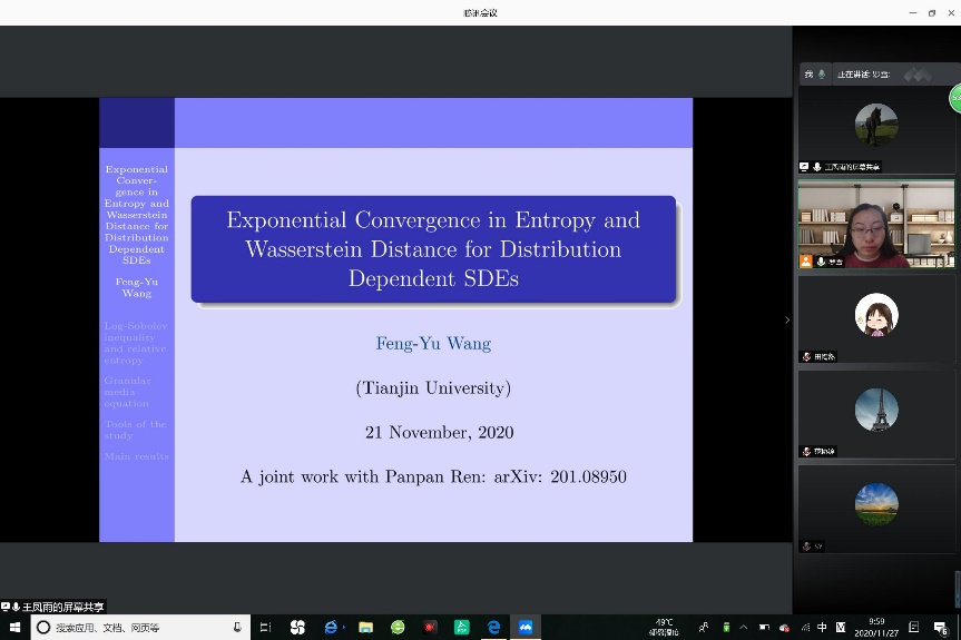 2020年11月27日上午,国家杰出基金获得者、长江特聘教授王凤雨教授受邀为太阳集团tcy8722师生带来了一场题为:“Exponential Convergence in Entropy and Wasserstein Distance for Distribution Dependent SDEs ”的学术报告。报告由太阳集团tcy8722统计与运筹系系主任罗雪副教授主持。