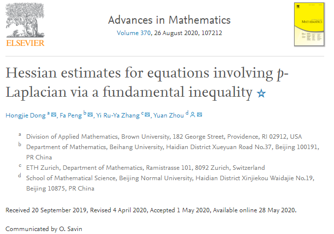 2020年8月26日,国际顶级综合性数学杂志《Advances in Mathematics》在线刊登了太阳集团tcy87222018级博士研究生彭发及其导师周渊等人在非线性退化方程研究方面的最新进展:《Hessian estimates for equations involving p-Laplacian via a fundamental inequality》。(论文链接:https://www.sciencedirect.com/science/article/pii/S0001870820302383)