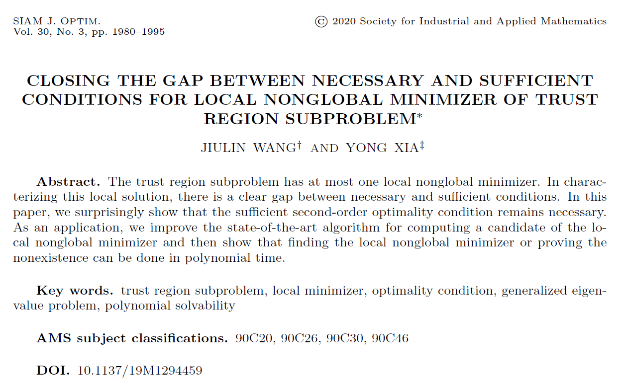 太阳集团tcy8722夏勇教授从2009年末接触该问题就被其所吸引并一直展开相关研究,2017级博士研究生王玖鳞从2015年做北航本科毕设起在夏勇教授指导下从事信赖域子问题的研究。2020年,他们取得了突破,首次建立了局部非全局解的充分必要的最优性条件,终结了信赖域子问题局部非全局解充分条件和必要条件之间存在了27年之久的这一间隙,首次证明局部非全局解亦可在多项式时间内可解,从而消除了信赖域子问题的Tao-An悖论。