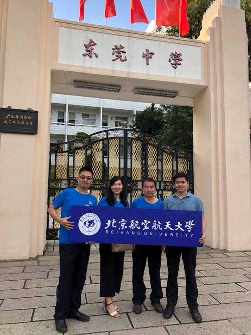 | 员工谭汉齐(左一)、何丽冬(左二)、马骋(右二)、黄伟华(右一)独立完成了北航在东莞中学的招生宣传工作 |