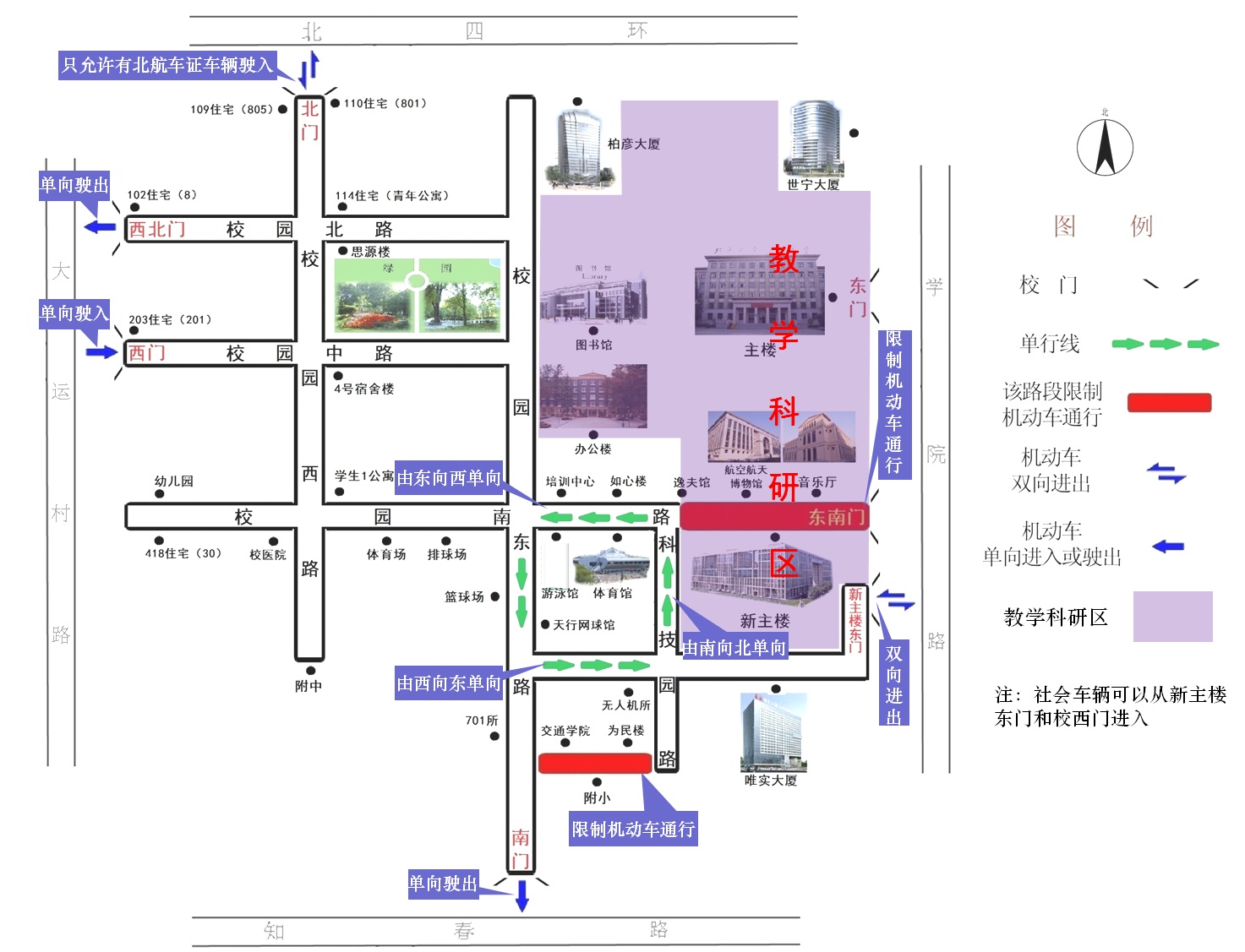 七、校园南路中段(体育馆、游泳馆与如心楼、培训中心之间道路)只允许机动车由东向西单向通行。