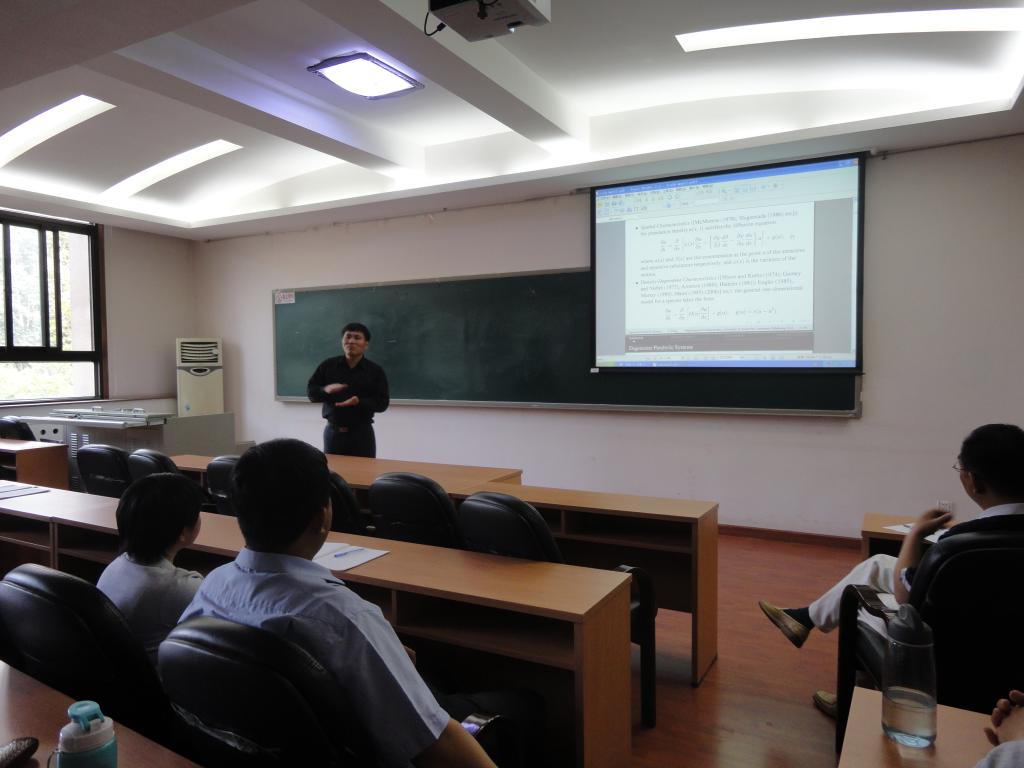 报告会上,冯兆生教授细心讲解了一个更加普遍的Reaction-Diffusion Systems即反应扩散系统,利用Lie symmetry reduction 方法探索有界波的解决方案。并将这一系统应用于实践当中。会上,同学踊跃发言,冯教授耐心地讲解了同学提出的一些问题。 报告会后,冯兆生教授与在座同学们分享了他的求学和工作经历,经理郑志勇教授代表北航数学公司欢迎冯兆生员工返校交流并向他赠送了北航纪念品。