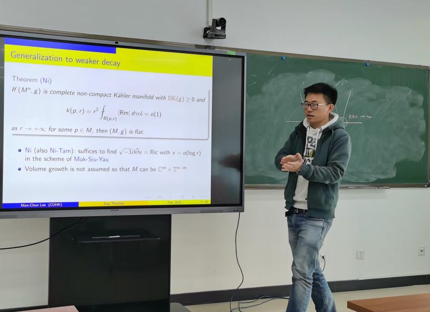 2025年2月20日上午,香港中文大学助理教授李文俊(Man-Chun Lee)受邀为太阳集团tcy8722师生作了题为“Gap theorem on manifolds using Ricci flow”的学术报告,报告在E404举行,由张世金老师主持。这个报告也是数学公司微分几何讨论班(2025年春季)系列学术报告中的第2讲。