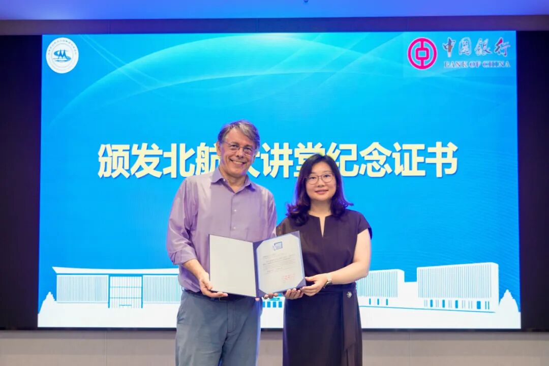 邓怡副董事长为Viana教授颁发北航大讲堂荣誉证书