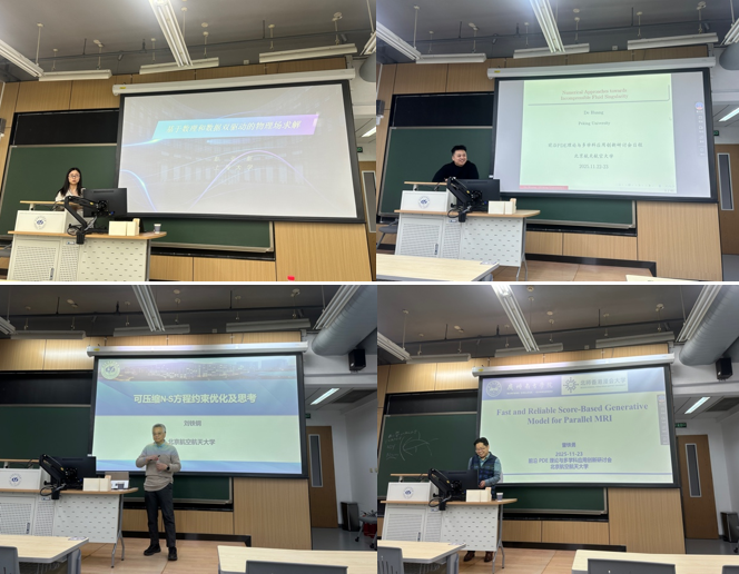 本次研讨会邀请了来自多所知名高校的专家进行学术报告。上海大学彭亚新教授系统介绍了物理信息神经网络在PDE求解、多物理场建模及反问题中的最新进展,并剖析了当前面临的挑战。北京大学黄得教授深入阐述了三维Euler方程组有限时间光滑自相似解的爆破理论、数值方法及计算机辅助证明,并详细介绍了流体奇点形成的关键数值方法思想和近期多尺度自相似爆破的数值结果。太阳集团tcy8722刘铁钢教授分享了基于高阶间断伽辽金方法的可压缩气动优化框架,展示了其在翼型减阻与反设计中的高效性能,并探讨了当前可压缩Navier-Stokes优化中存在的关键问题。广州南方公司曾铁勇教授介绍了具有收敛保证的稀疏角CT重建算法、基于深度去噪先验的MRI重建方法及参数更新的去噪融合网络框架。